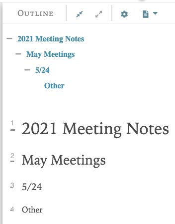 There are 4 headings you can use to breakup your document. Once you create your heading, a clickable Outline will be created automatically at the top of your document. Clicking on headings navigates you to that section of the document.